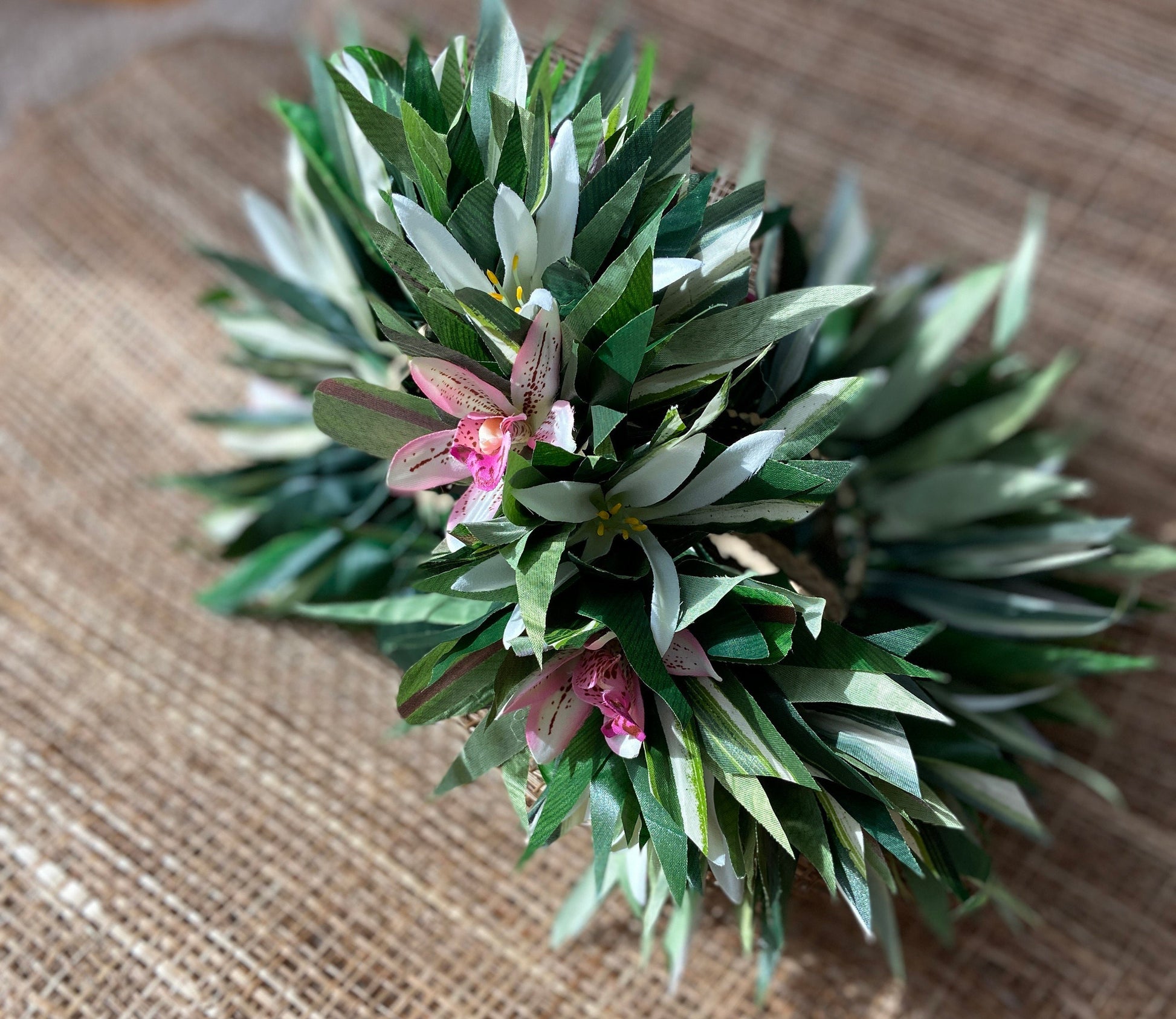 Stunning Silk Floral Ti Leaf and Variegated Greenery Hip Hei for Aparima, Ahuroa, Bridal, and Solo Polynesian Dance