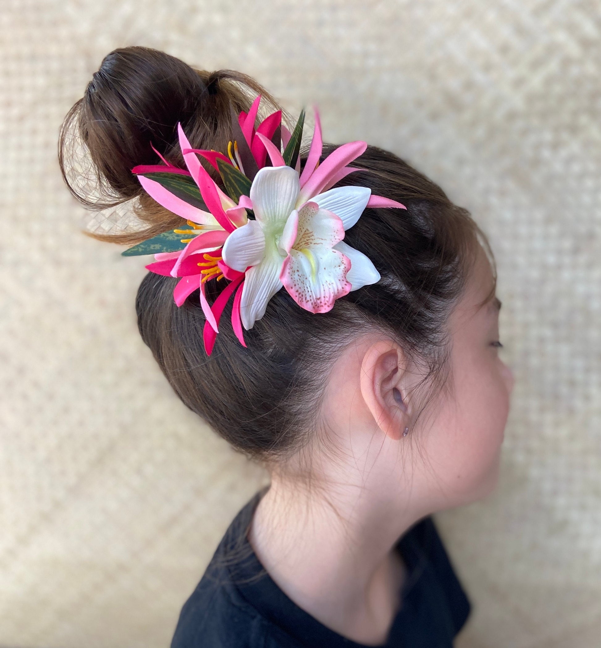 Vibrantly colored, ultra-saturated pigments in premium designer floral blooms and beautiful artificial ti leaves make this highly realistic Okika Orchid hair clip the quintessential Polynesian accessory for Luau, Performances, or Competition