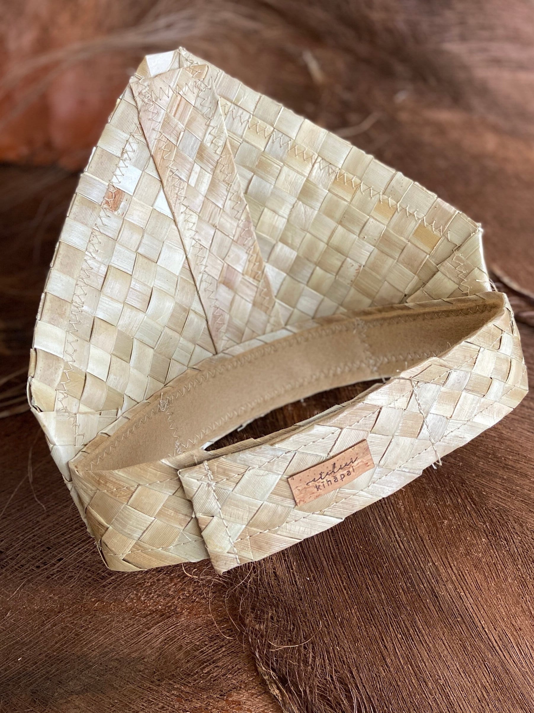 Reusable Premier Ori Tahiti Headdress Base has Fully lined Headdress Band with heavy duty Theatrical Grade Velcro Closure for DIY Costuming Lauhala Base Plates are lightly varnished and stay-stitched to headbands Banding fabric is solid beige to coordinate with the various shades of naturally dried lauhala leaves, coco palm raffia, and Tapa/Kapa/Siapo/Ngatu or solid deep green to complement traditional foliage of Ti, Croton, Dieffenbacchia, Song of India, et al.