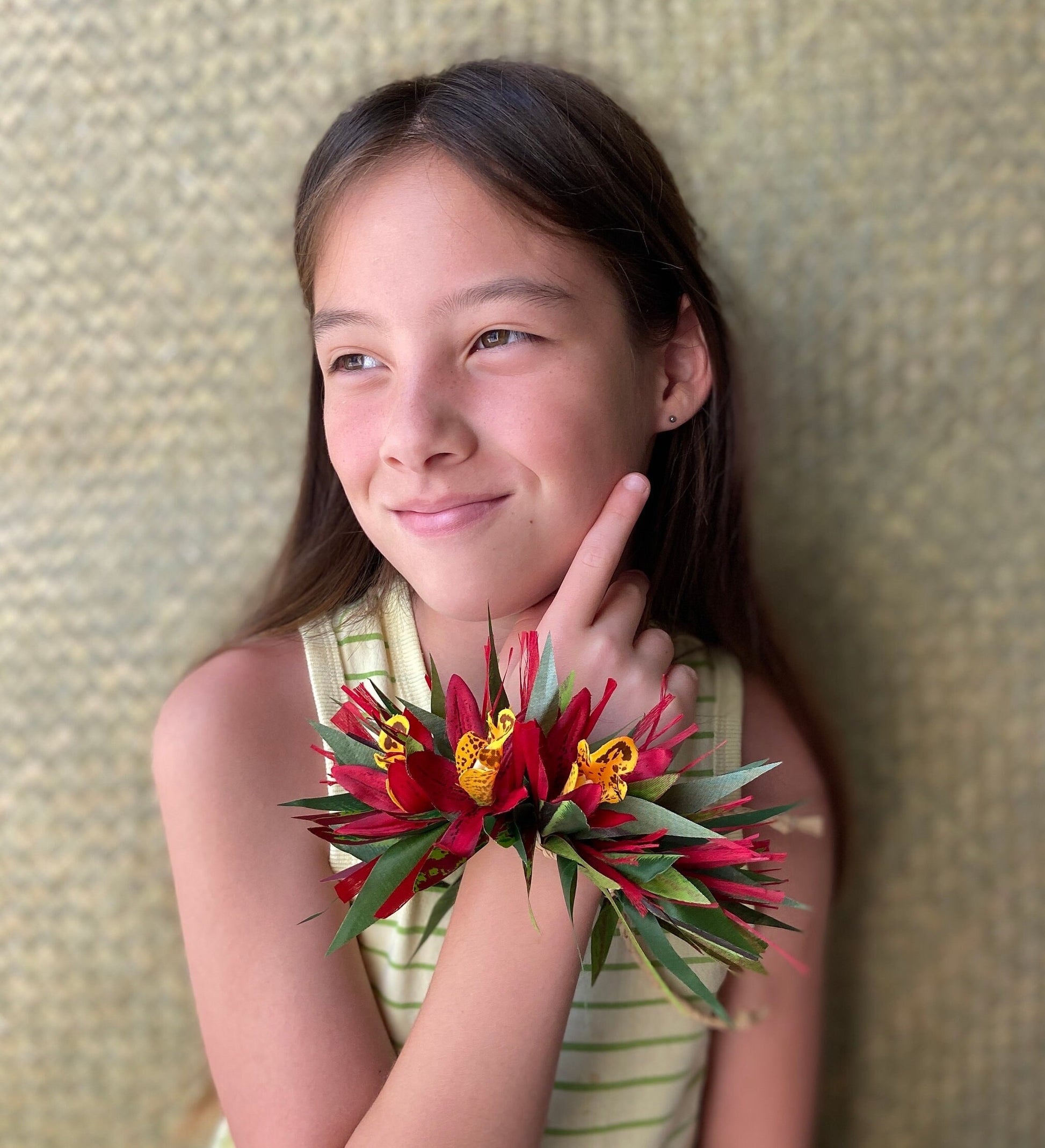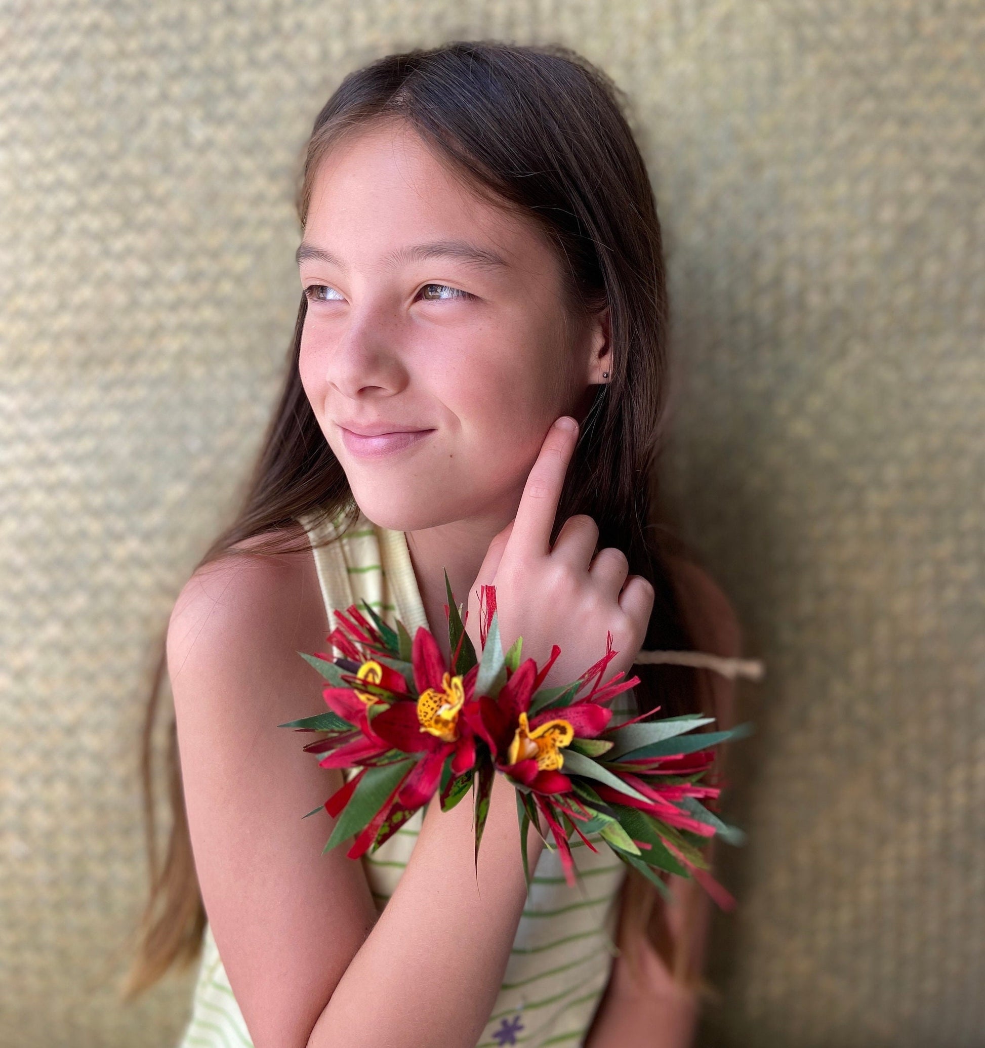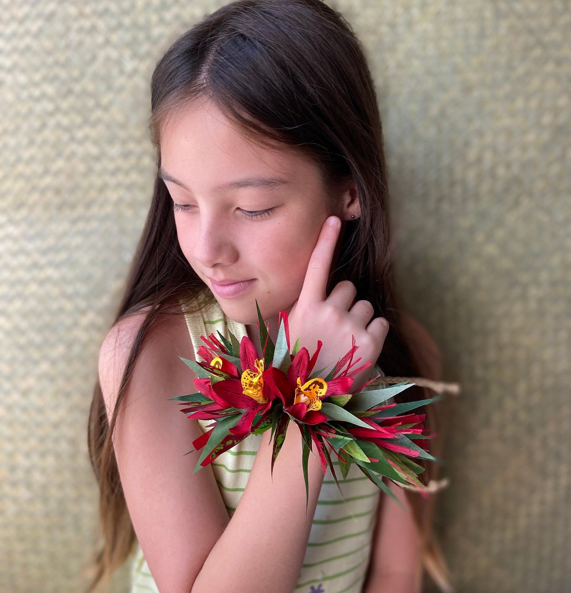 Royal Hawaiian Royal Polynesian Orchid Silk Ti Leaf and Variegated Greenery Na Kupe'e for Wrists and Ankles Doubles as a Hair Bun Wrap