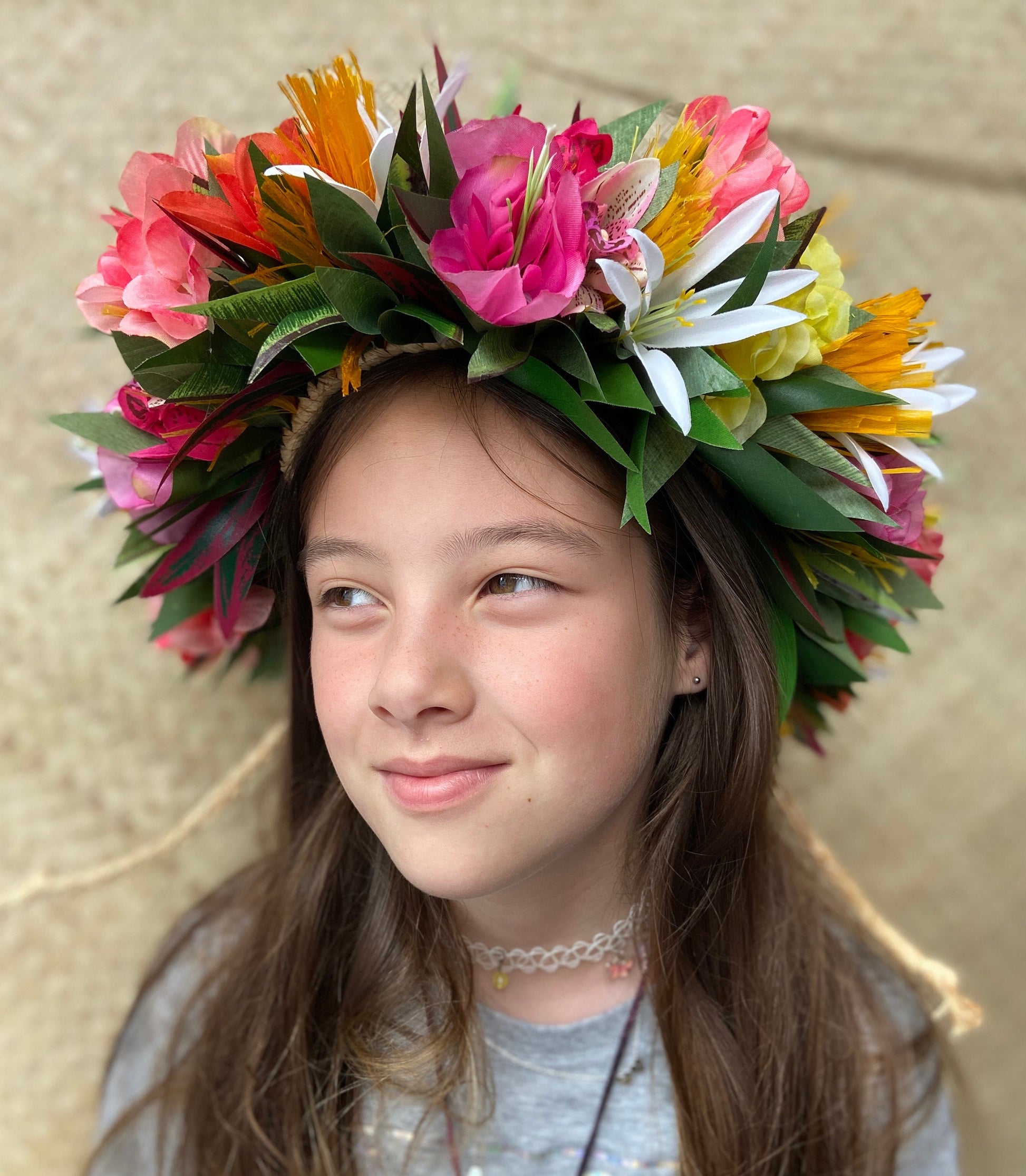 This special order lei po’o features feminine Princessa florals in the elegant Rarotongan Cook Islands silhouette which frames the face and highlights the eyes. Lovely for portraits, Senior photos, maternity/expectant parent photos, Aparima or Ahuroa performances 100% Vegan Silk Greenery and Florals