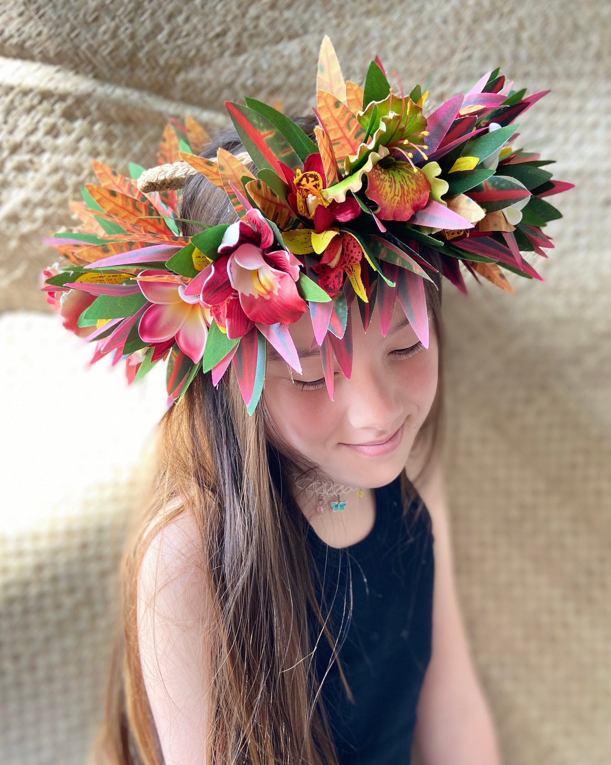 The finest quality high-definition silk ti leaves, croton, and plum Cordyline are tightly woven into a ultra-full Kahiko style crown; decorated with the most realistic premium foam star plumeria blooms and gorgeous handmade orchids