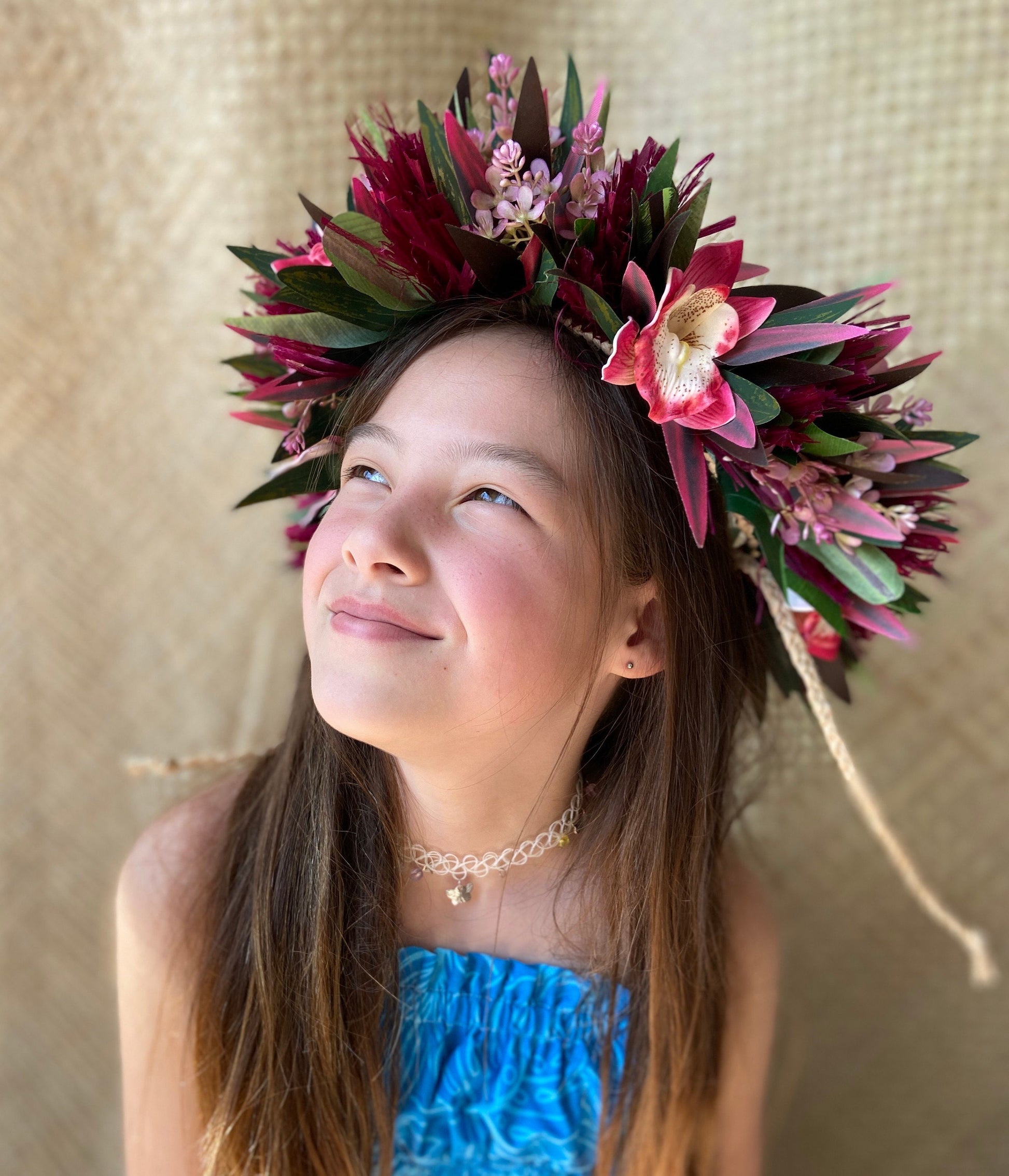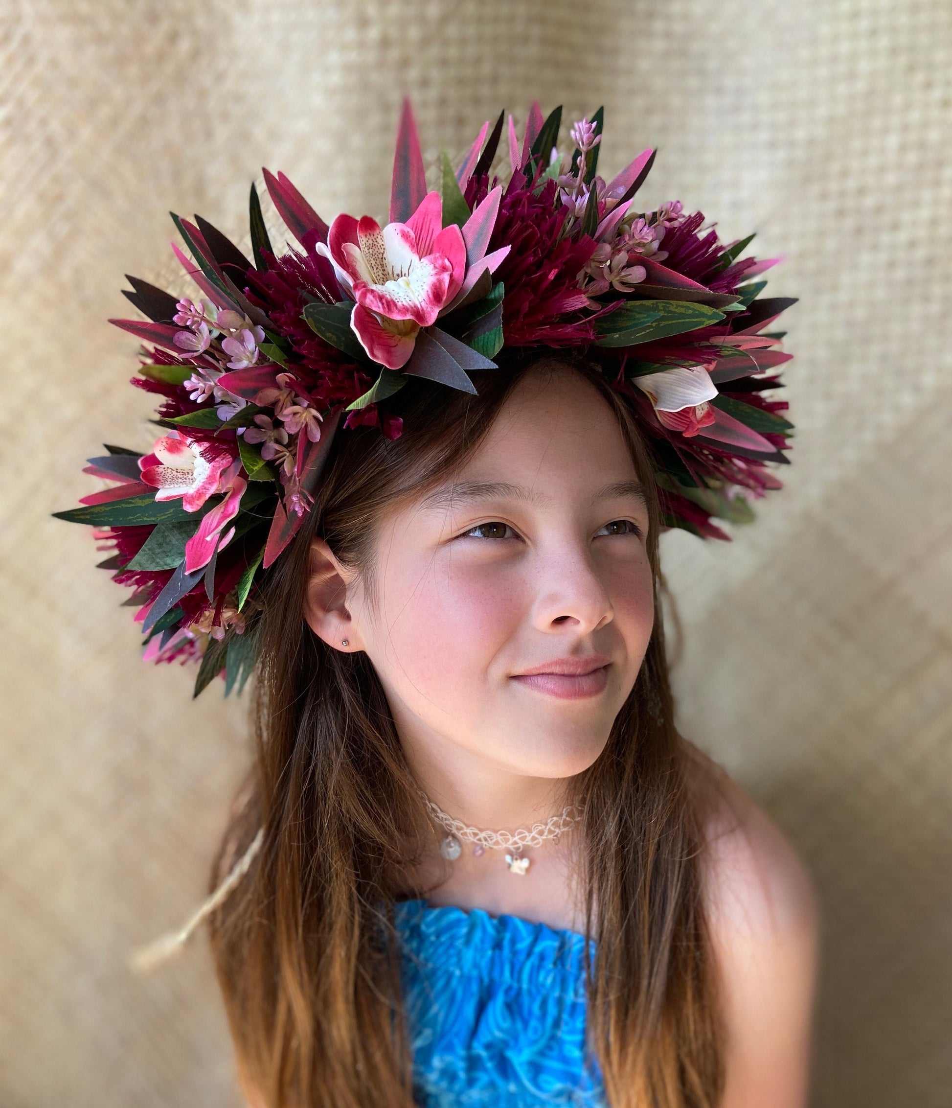 Beautiful Lei Po’o Stunner can be worn as Lei Po’o or Aparima-Ahuroa-Mehura style floral belt