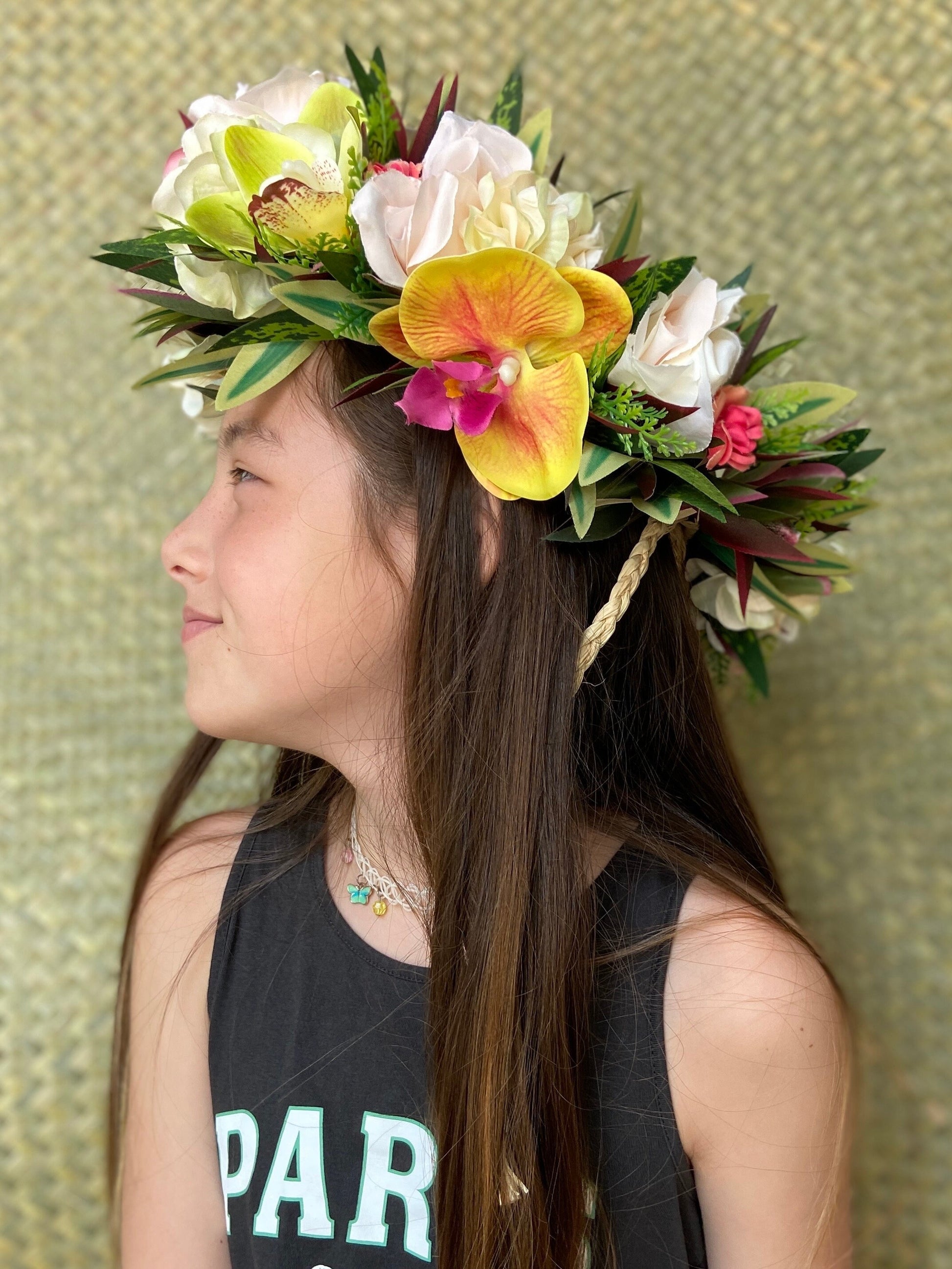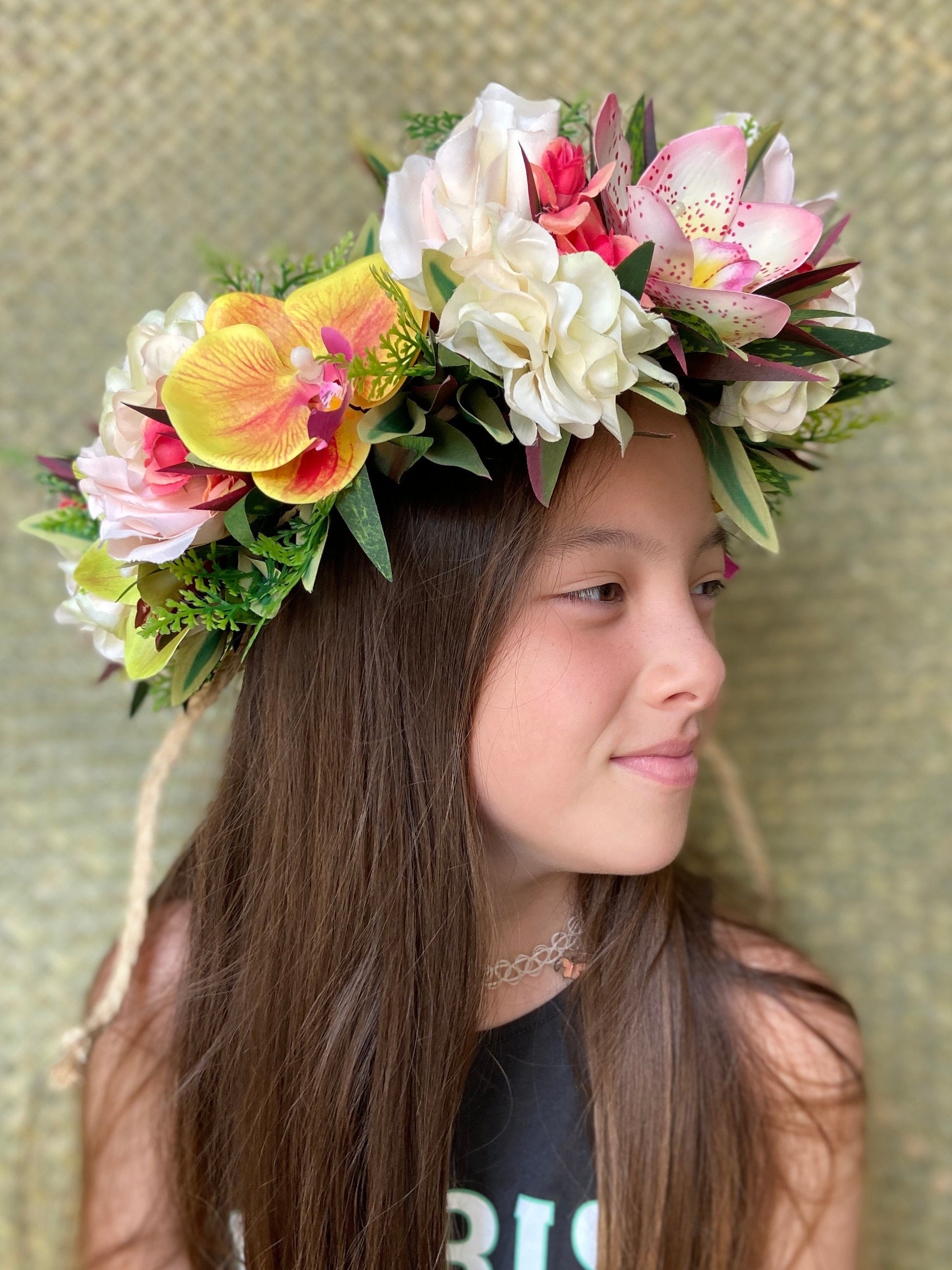 Lei Po'o for Adults, Children, and Teens Ultra full, luxurious silhouette in premier finish for Professional Performers, Competitors, and Touring Dance Companies Adjustable and Versatile Styling--can be worn as a Flower Crown, Tiara, Aparima and Mehura Belt, or Hair Wrap depending on how it is tied