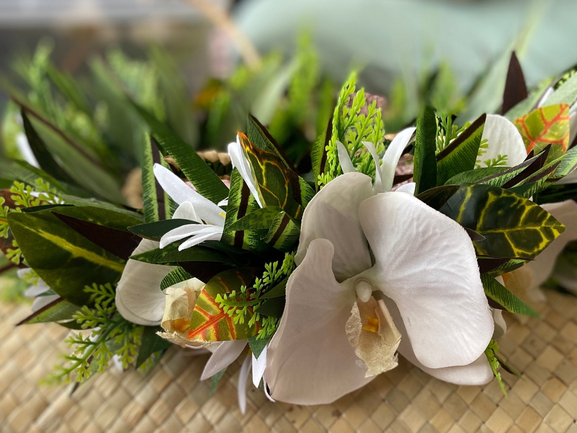 Adjustable and Versatile Styling--can be worn as a Flower Crown, Tiara, or Hair Wrap depending on how it is tied Hawaiian Haku Style Flower Crown overflowing with abundant Vibrant Tropical Orchids and Cordyline Fruiticosa Ti Leaves of all varieties 100% Vegan Silk Greenery and Florals
