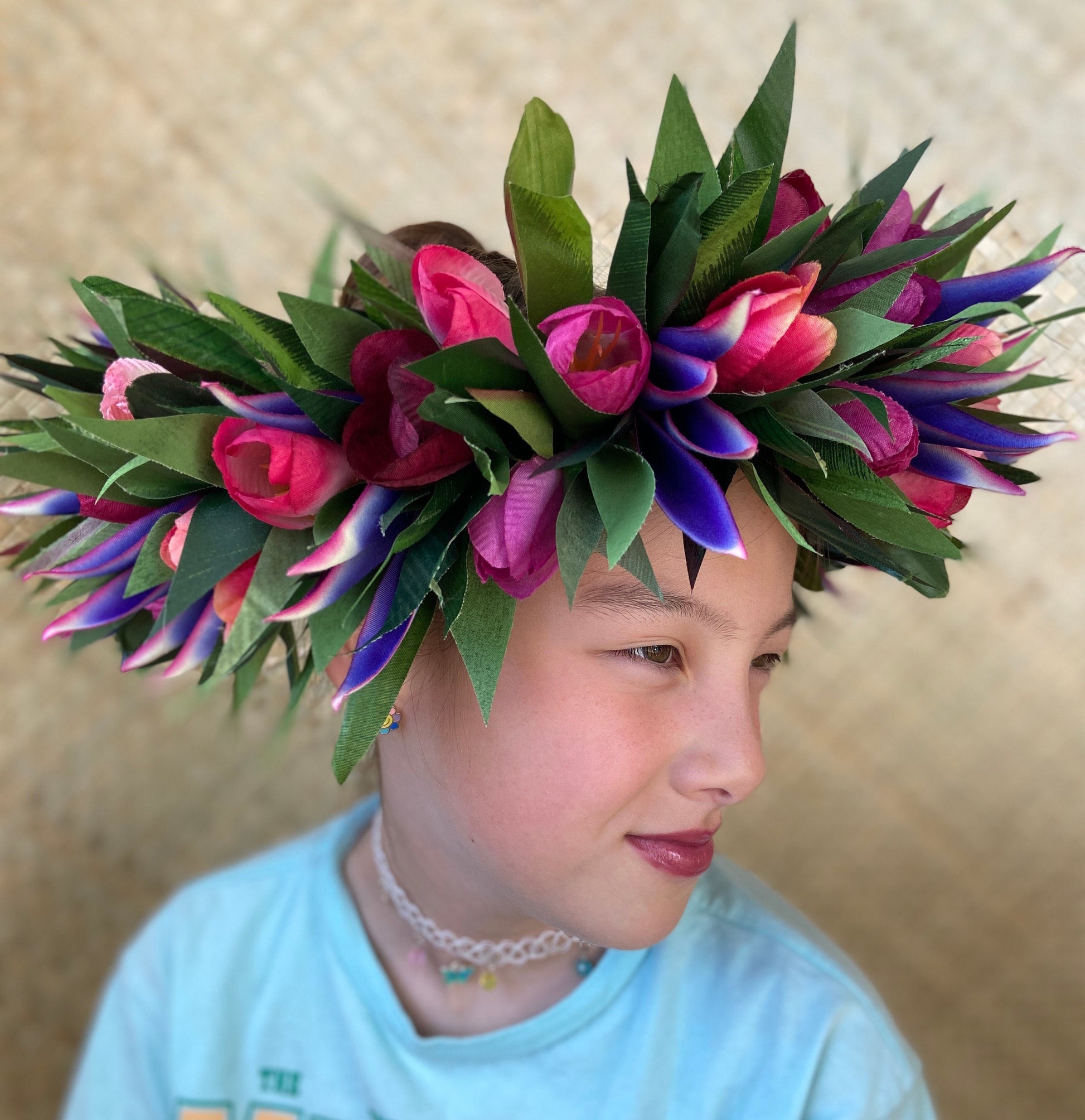 Silk Ti Leaf and Variegated Greenery Lei Po'o Adjustable and Versatile Styling--can be worn as a Flower Crown, Tiara, or Hair Wrap depending on how it is tied Hawaiian Style Flower Crown with Tropical Flora in a lushly blooming silhouette
