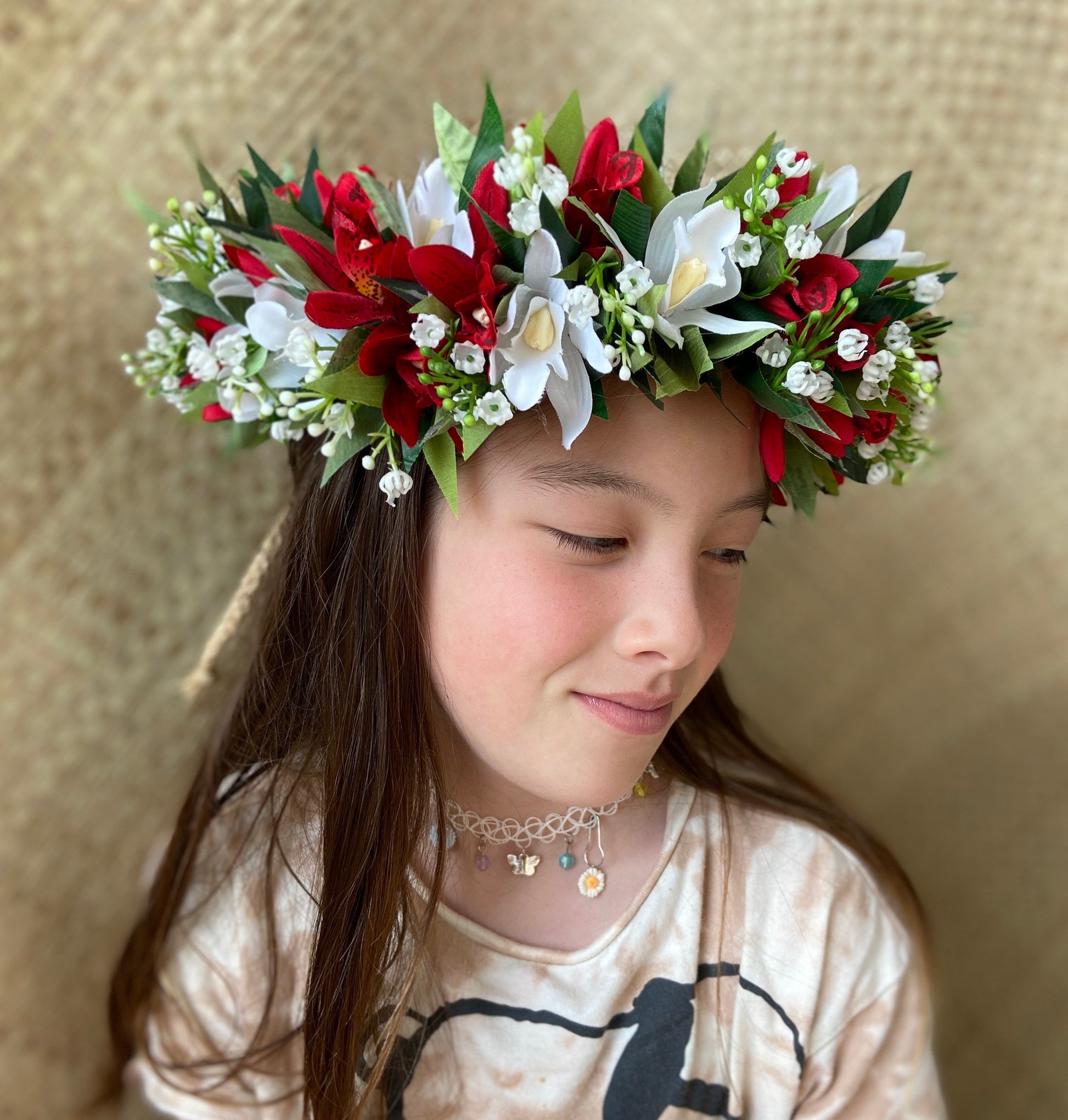 Hawaiian Haku Style Flower Crown overflowing with Vibrant Tropical Orchids and Cordyline Fruiticosa Ti Leaves of all varieties Royal Hawaiian Crimson Tiger Orchids and Baby Snow Queen Orchids with delicate sprays of Baby’s Breath Blooms