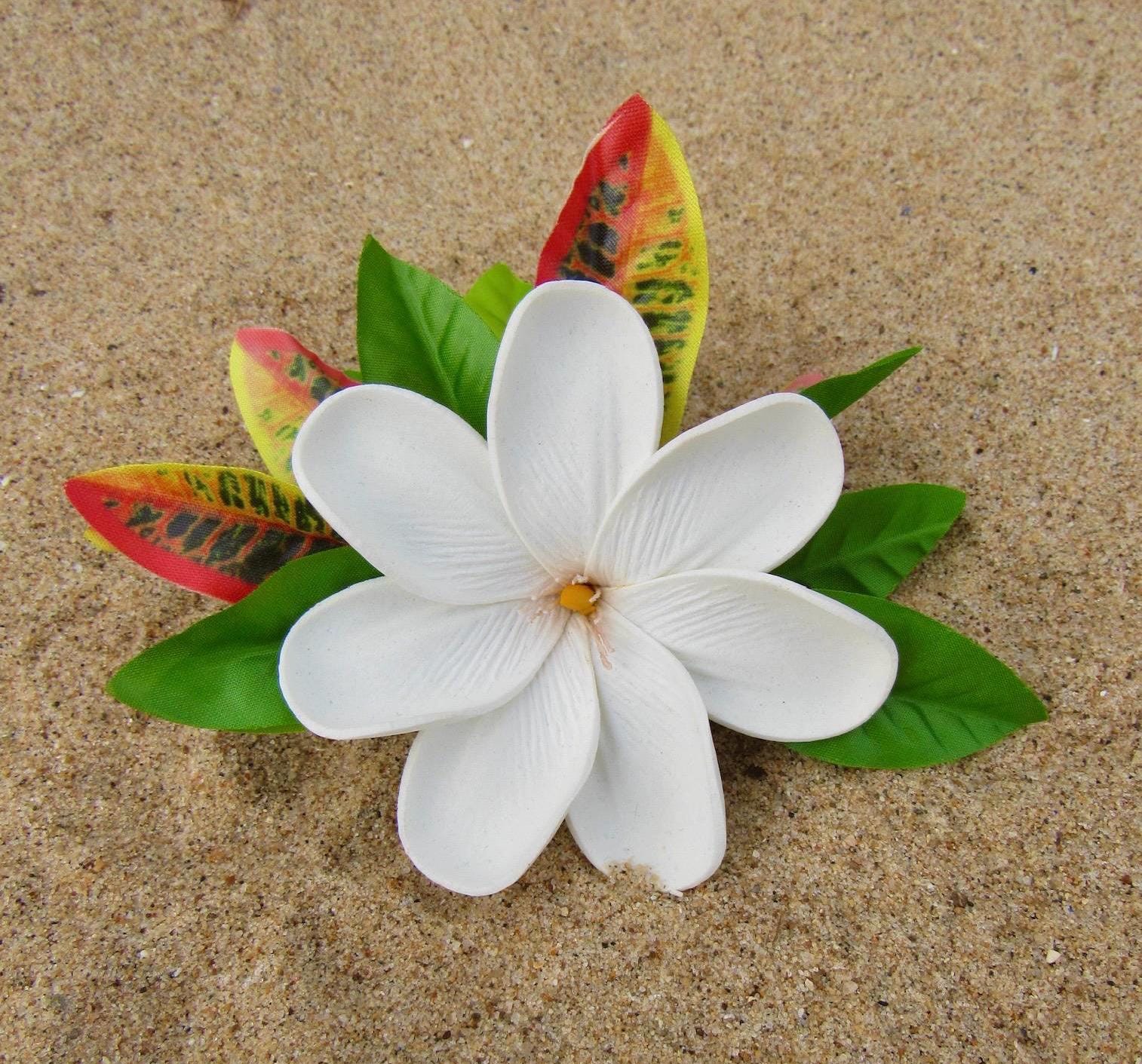 Beautifully sculpted Ladyfinger Tiare blossom, also known as the Tahitian Gardenia, is accented with baby Croton and mini Maile leaves in this contemporary French Polynesian Style Hair Clip.