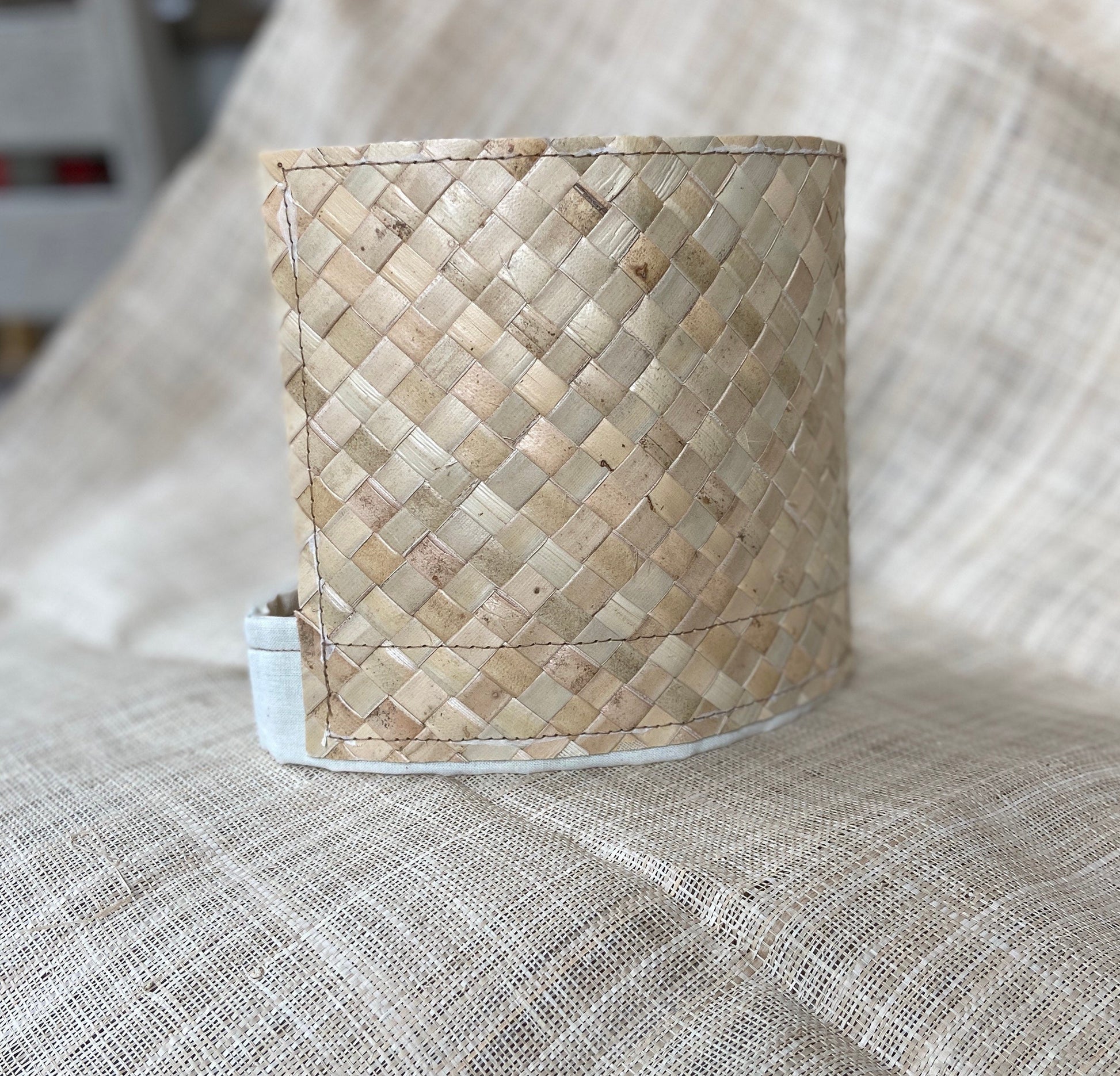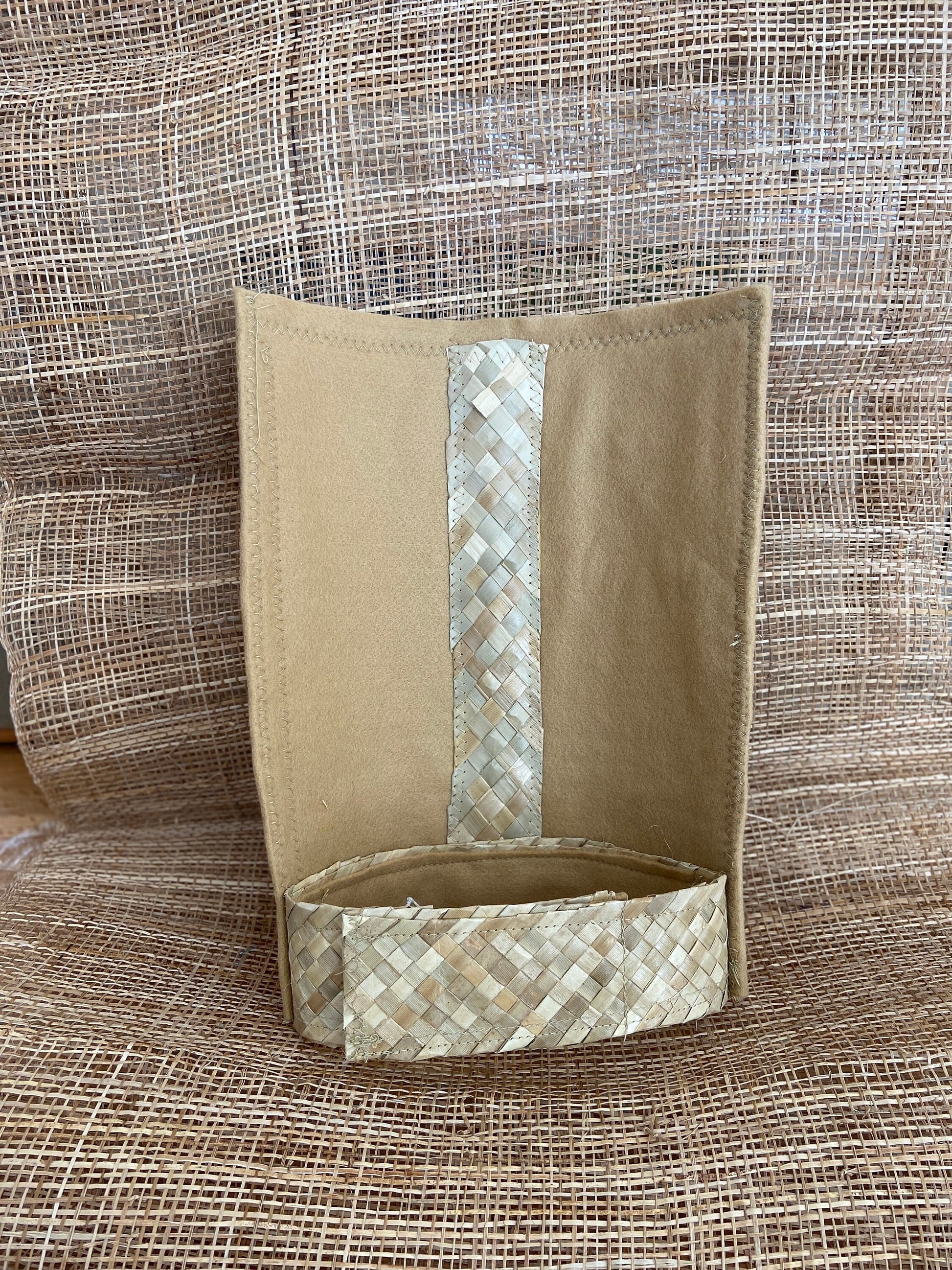 Lining is solid beige/brown to coordinate with the various shades of naturally dried lauhala leaves, coco palm raffia, and Tapa/Kapa/Siapo/Ngatu