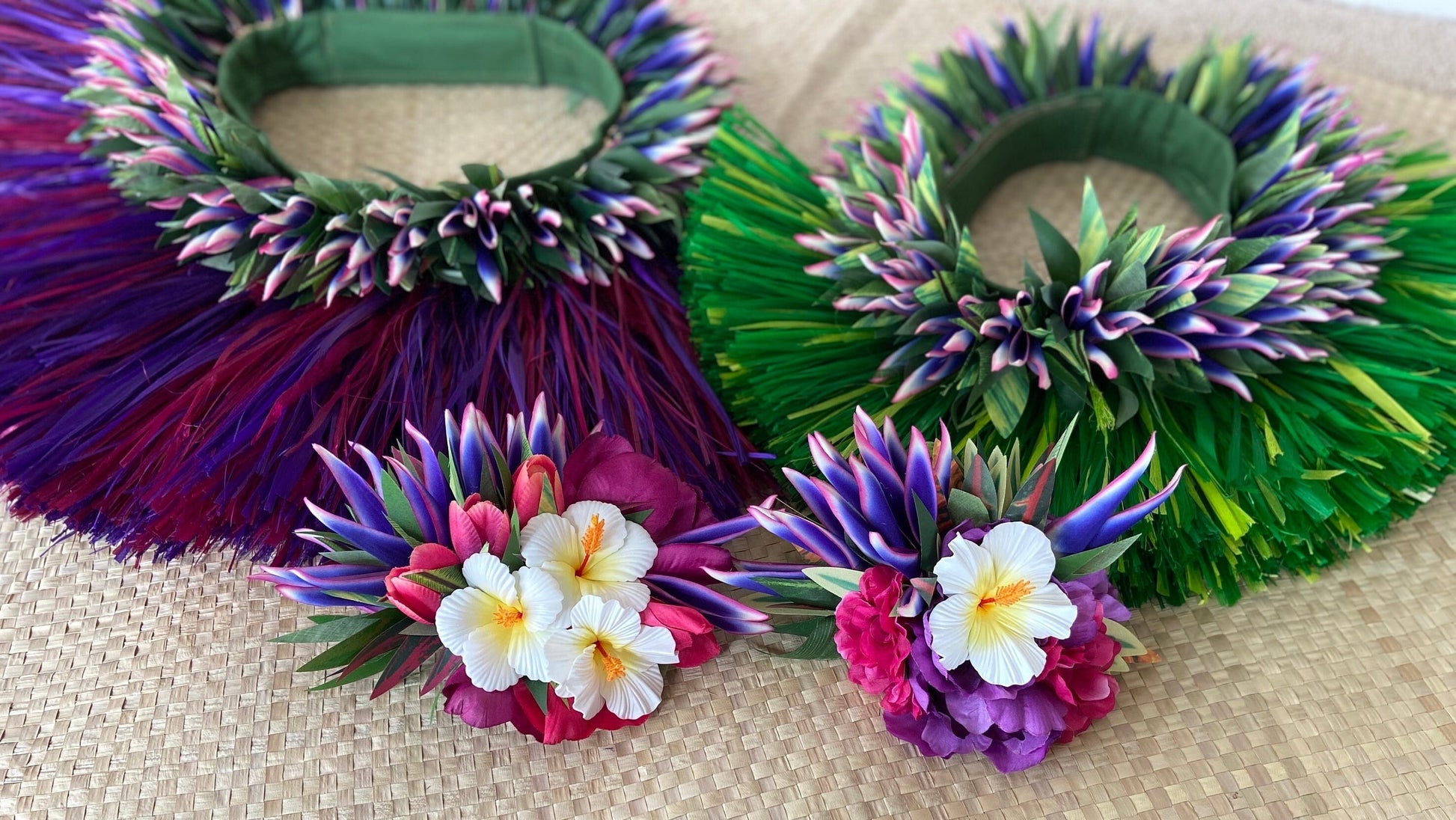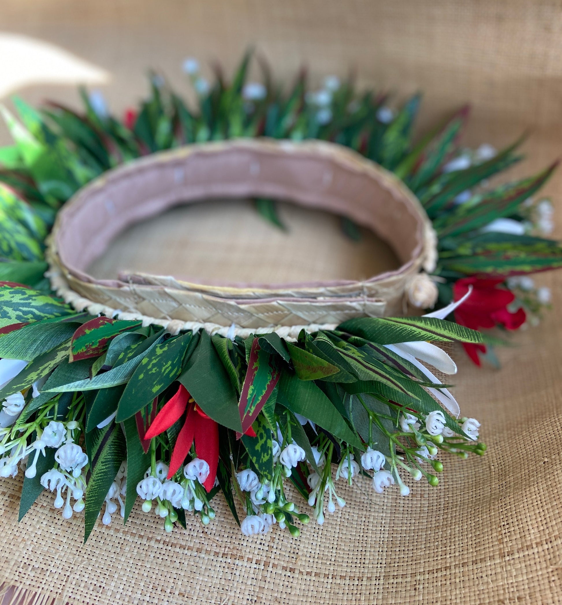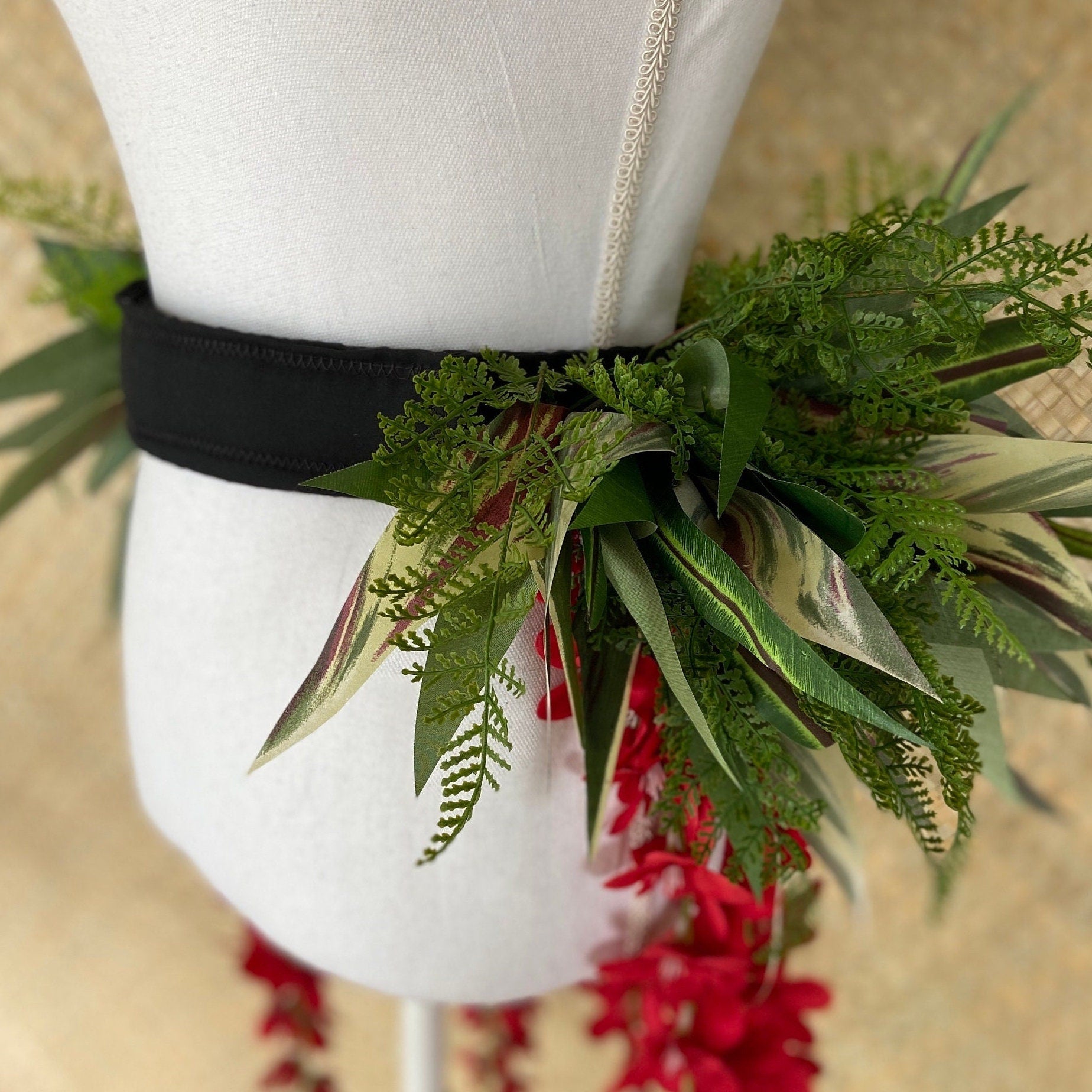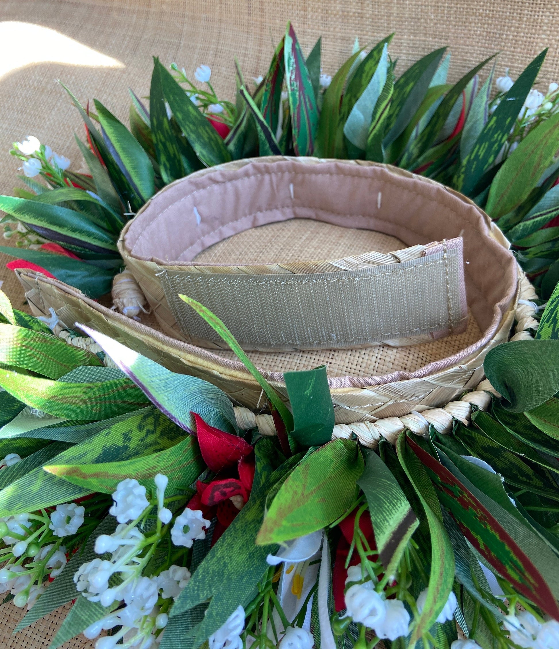 Traditional woven Lauhala band backed with ultra thick premium pressed felt or booklet folded poplin fabric is machine stitched on all edges to a clean finish with 5” adjustable Velcro closure, then hand tacked to your hip hei or lei po’o with individually knotted whipstitches using the highest quality waxed threads